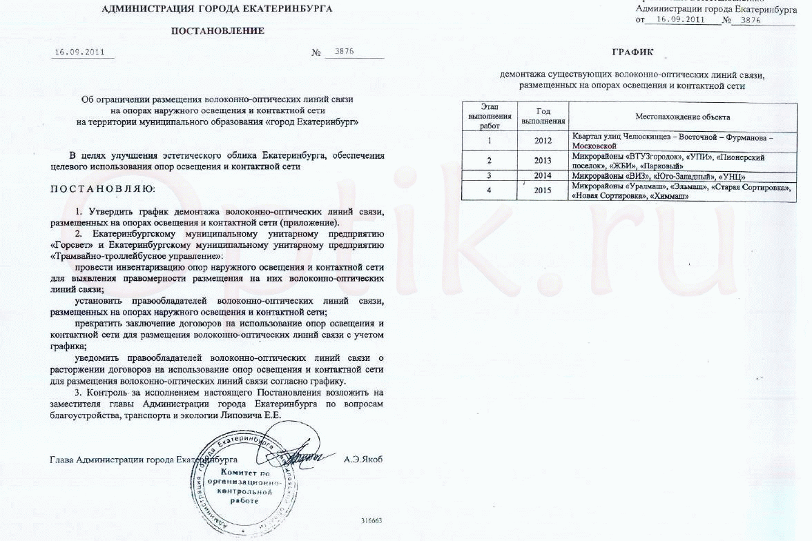 2011-10-06 Глава Администрации города Екатеринбурга 16.09.2011 принял постановление "Об ограничении размещения волоконно-оптических линий связи на опорах наружного освещения и контактной сети на территории муниципального образования "город Екатеринбург""